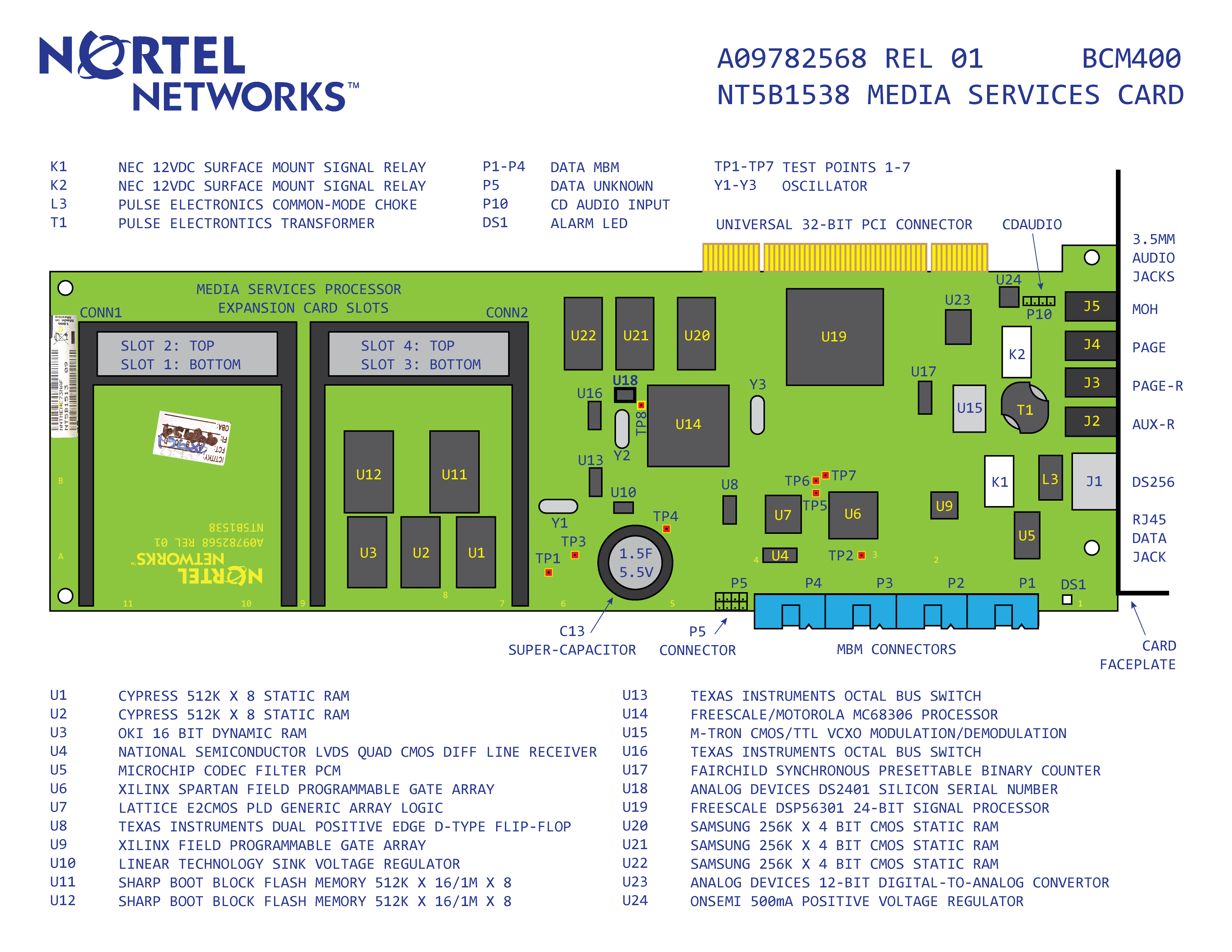 The Media Services Card (MSC) connects to the BCM400 Base Function Tray (BFT) through a riser from the PCI slot on the SH815 motherboard. It provides digital signal processing, buses for Media Bay Modules and contains system programming on multiple FLASH/RAM chips. System memory is maintained by a supercapacitor. The MSC carries the DS2401 silicon serial number chip (U18) that provides the System ID. All feature licensing is driven by the System ID. When diagnosing hardware failures, before scrapping your MSC, be sure to try it on a new BFT, in order to preserve your licensed features.